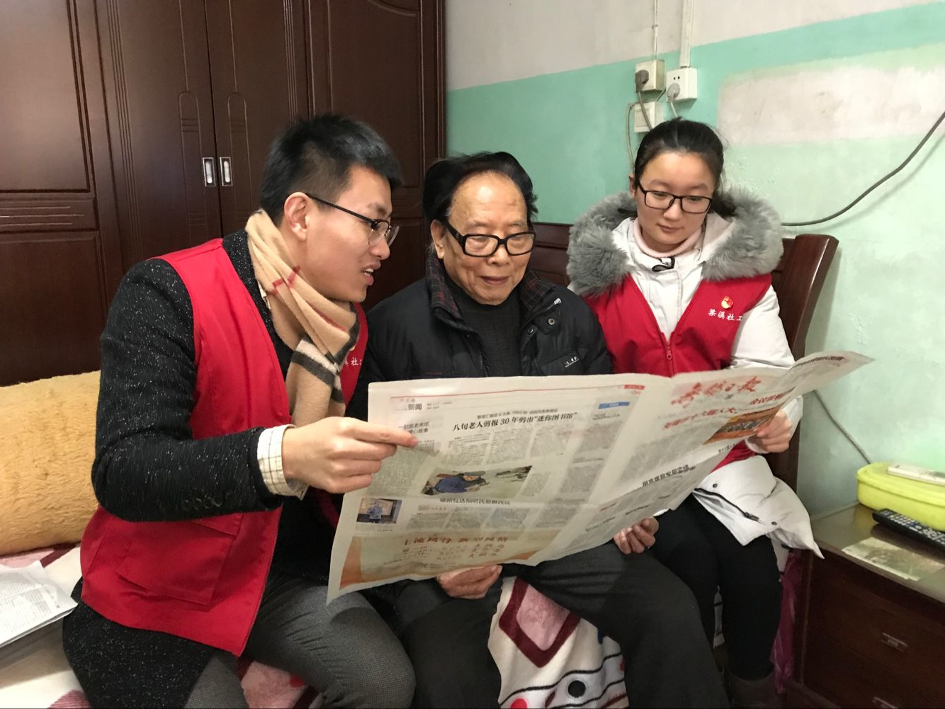 1月15日,随着无锡市两会的胜利闭幕,为了让社区的独居老人们及时了解两会资讯,社区的社工们带着近期的《无锡日报》《江南晚报》《江南保健报》等报纸入户上门为老年人们读报。